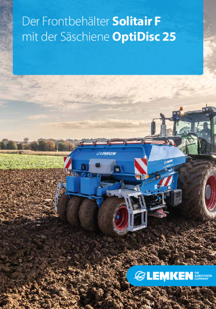 Der Solitair F Frontbehälter ist auch in einer 1.900 Liter fassenden Variante erhältlich. Der druckfeste Einzelbehälter ist mit zwei düngerfesten Dosiereinheiten ausgestattet, damit ist er wahlweise mit einer Einzelkornsämaschine oder aber einer Kombination aus Zirkon 12 und OptiDisc 25 einsetzbar.
