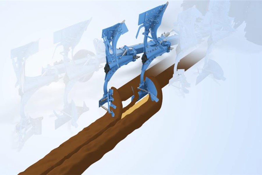 Der Carbon Farming Pflug kombiniert klassische Pflugtechnik mit innovativer Tiefenlockerung. Er besitzt sowohl flach als auch tief arbeitende Schare, die sich in festen Abständen abwechseln.