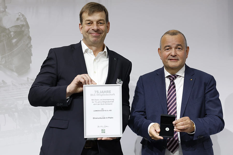 Als Dank und Anerkennung zeichnete der DLG-Vorstand LEMKEN in Hannover für 75 Jahre DLG-Mitgliedschaft mit der Ehrenurkunde und der Ehrennadel in Platin aus. Anlässlich der Agritechnica überreichte der DLG-Präsident Hubertus Paetow die Urkunde an Anthony van der Ley.