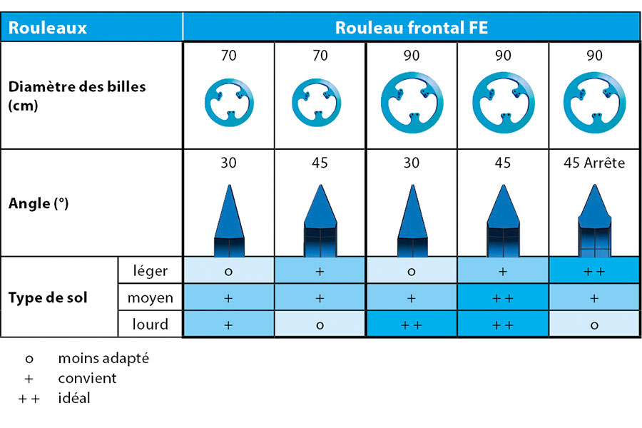 La conception sans moyeu central du rouleau plombeur évite les bourrages à l’intérieur du rouleau. La forme des billes, leur profil et la conception particulière du système de fixation garantissent une très haute stabilité, une excellente résistance aux chocs et une usure minimale. La maintenance est ainsi réduite, même sur sols pierreux.